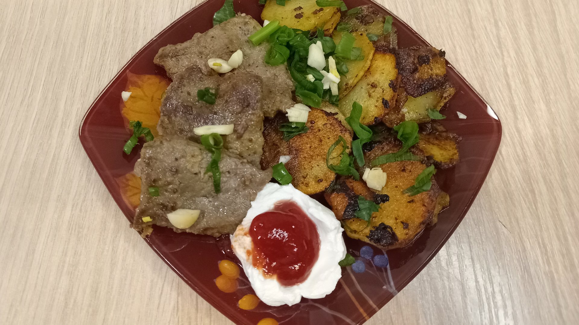Печень любая-500г,1 яйцо, 2 ст ложки крахмала, соль, перец. (мариновать минут 40,можно дольше) Жарим с двух сторон по 2-3мин, убрать готовую печень со сковороды и пожарить картошки😋. Приятного аппетита!