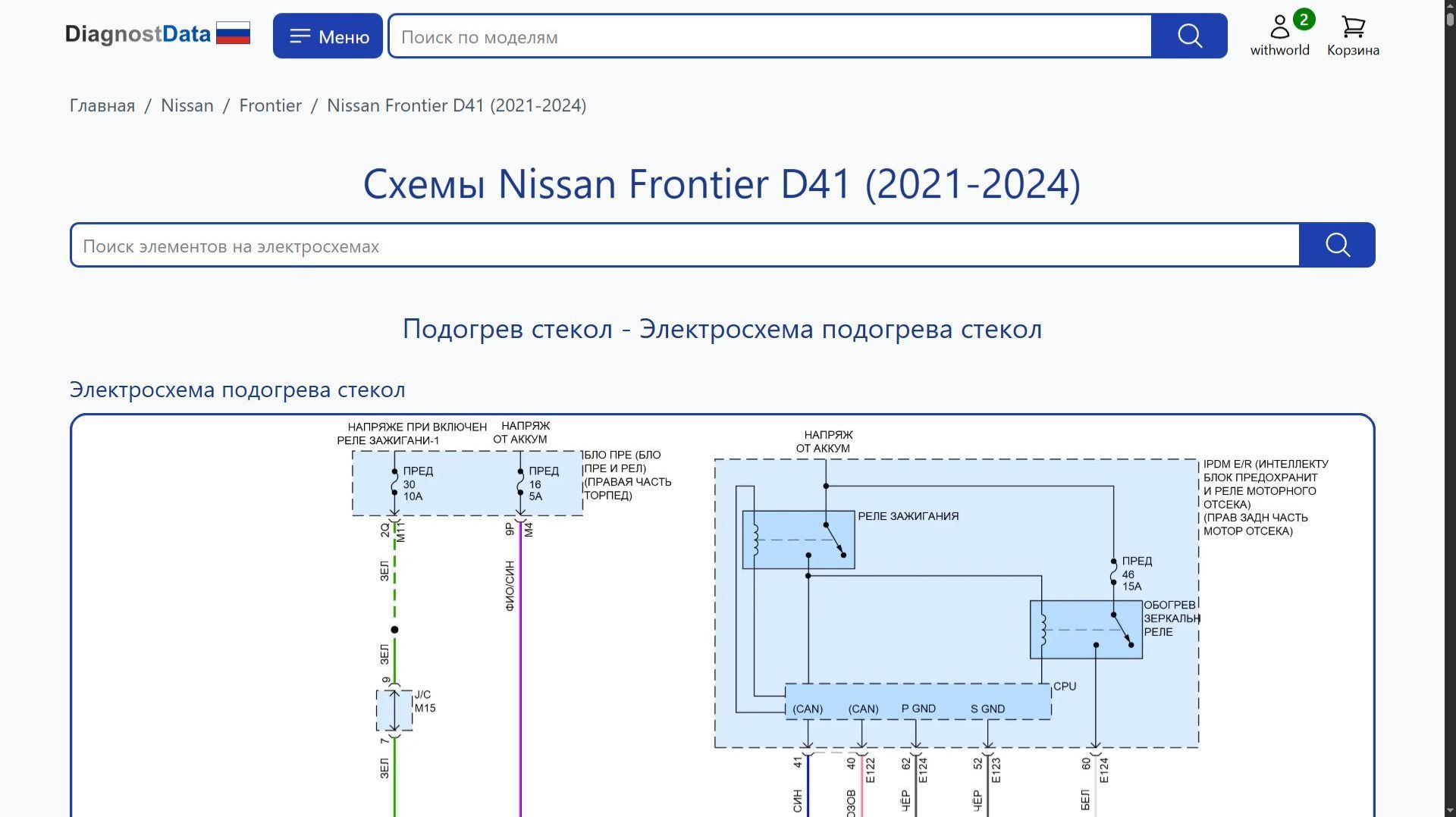 https://diagnostdata.ru/nissan/frontier/d41-2021-2024/ Электрохемы, распиновки, схемы электропроводки Nissan Frontier D41 (2021, 2022, 2023, 2024 годов выпуска) 3.8L Схемы на русском языке для систем: Схемы Подогрев стекол, Схемы Освещение салона, Схемы Антиблокировочная система abs, Схемы Сиденья, Схемы Кондиционирование воздуха, Схемы Блокировка селектора, Схемы Магнитола, Схемы Стеклоподъемники, Схемы Can шина, Схемы Приборная панель, Схемы Вентилятор охлаждения, Схемы Стартер/генератор, Схемы Сигнализация, Схемы Коробка передач, Схемы Круиз-контроль, Схемы Фары, Схемы Предупреждение, Схемы Фары и фонари, Схемы Точки подключения масс, Схемы Складная крыша/люк, Схемы Клаксон, Схемы Блок предохранителей и реле, Схемы Управление зеркалами заднего вида, Схемы Блоки управления кузовом, Схемы Подушки безопасности, Схемы Системы помощи водителю, Схемы Центральный замок, Схемы Дворники и омыватели, Схемы Двигатель, и др.