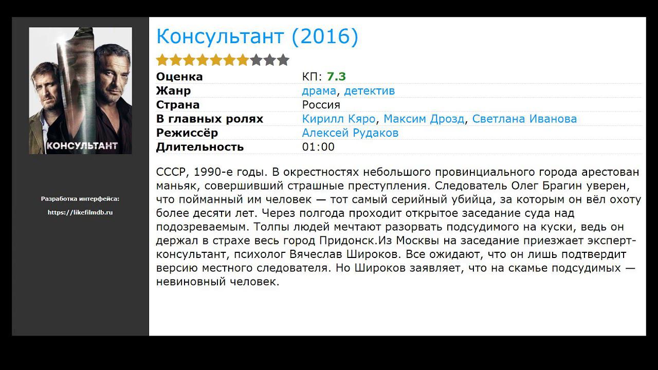 Список лучших русских фильмов про убийцу, отобранных посетителями нашего сайта: 00:00 Вступление 00:10 12 часов (2019) / жанр: детектив, криминал, боевик / в главных ролях: Эдуард Флёров, Александр Пашков, Юрий Батурин 00:26 Мосгаз. Новое дело майора Черкасова (2019) / жанр: детектив, криминал, боевик / в главных ролях: Андрей Смоляков, Марина Александрова, Юрий Чурсин 00:45 Мертвым повезло (2017) / жанр: комедия, ужасы / в главных ролях: Дмитрий Богдан, Алексей Дербунович, Андрей Поведский 01:01 Восемь бусин на тонкой ниточке (2017) / жанр: детектив / в главных ролях: Людмила Зайцева, Мария Козлова, Александр Устюгов 01:20 Чистое искусство (2016) / жанр: триллер, детектив / в главных ролях: Анна Чиповская, Пётр Фёдоров, Константин Юшкевич 01:33 Ненавижу (2016) / жанр: мелодрама / в главных ролях: Елена Аросьева, Елена Оболенская, Светлана Аникей 01:46 За лучшей жизнью (2016) / жанр: мелодрама / в главных ролях: Анна Леванова, Александр Яцко, Андрей Сенькин 02:05 Вероника не хочет умирать (2016) / жанр: детектив, мелодрама / в главных ролях: Анастасия Лукьянова, Константин Самоуков, Родион Вьюшкин 02:18 Консультант (2016) / жанр: детектив, драма / в главных ролях: Кирилл Кяро, Максим Дрозд, Светлана Иванова 02:37 Каннибал (2013) / жанр: триллер / в главных ролях: Антонио де ла Торре, Олимпия Мелинте, Мария Альфонса Россо 02:57 Мачете убивает (2013) / жанр: боевик, комедия / в главных ролях: Дэнни Трехо, Мишель Родригес, Эмбер Хёрд 03:10 Джентльмены, удачи! (2012) / жанр: комедия, криминал / в главных ролях: Сергей Безруков, Гоша Куценко, Антон Богданов 03:23 Человек (2012) / жанр: короткометражка / в главных ролях: Марк Розовский, Юрий Батурин, Сергей Афанасьев 03:36 Искупление (ТВ) (2010) / жанр: боевик, мелодрама / в главных ролях: Владимир Вдовиченков, Ольга Филиппова, Михаил Долгинин 03:55 Кожа Саламандры (2004) / жанр: триллер, детектив / в главных ролях: Валерий Гаркалин, Рамиль Сабитов, Елена Шевченко 04:08 Убей меня! Ну, пожалуйста (ТВ) (2004) / жанр: мелодрама, комедия, детектив / в главных ролях: Дмитрий Харатьян, Ольга Погодина, Алексей Кравченко 04:21 Немой свидетель (1994) / жанр: ужасы, триллер / в главных ролях: Марина Зудина, Фэй Рипли, Эван Ричардс 04:34 Золото (1993) / жанр: драма, история / в главных ролях: Франко Неро, Виттория Бельведер, Александр Абдулов ► Какой фильм посмотреть сейчас? Более 300 подборок: https://likefilmdb.ru/service/movies/what-to-see/ ► Какой сериал посмотреть сейчас? Более 300 подборок: https://likefilmdb.ru/service/tv-series/what-to-see/ LikeFilmDB — это открытое сообщество, вы можете оценивать списки фильмов, похожие фильмы и сериалы без регистрации на сайте.