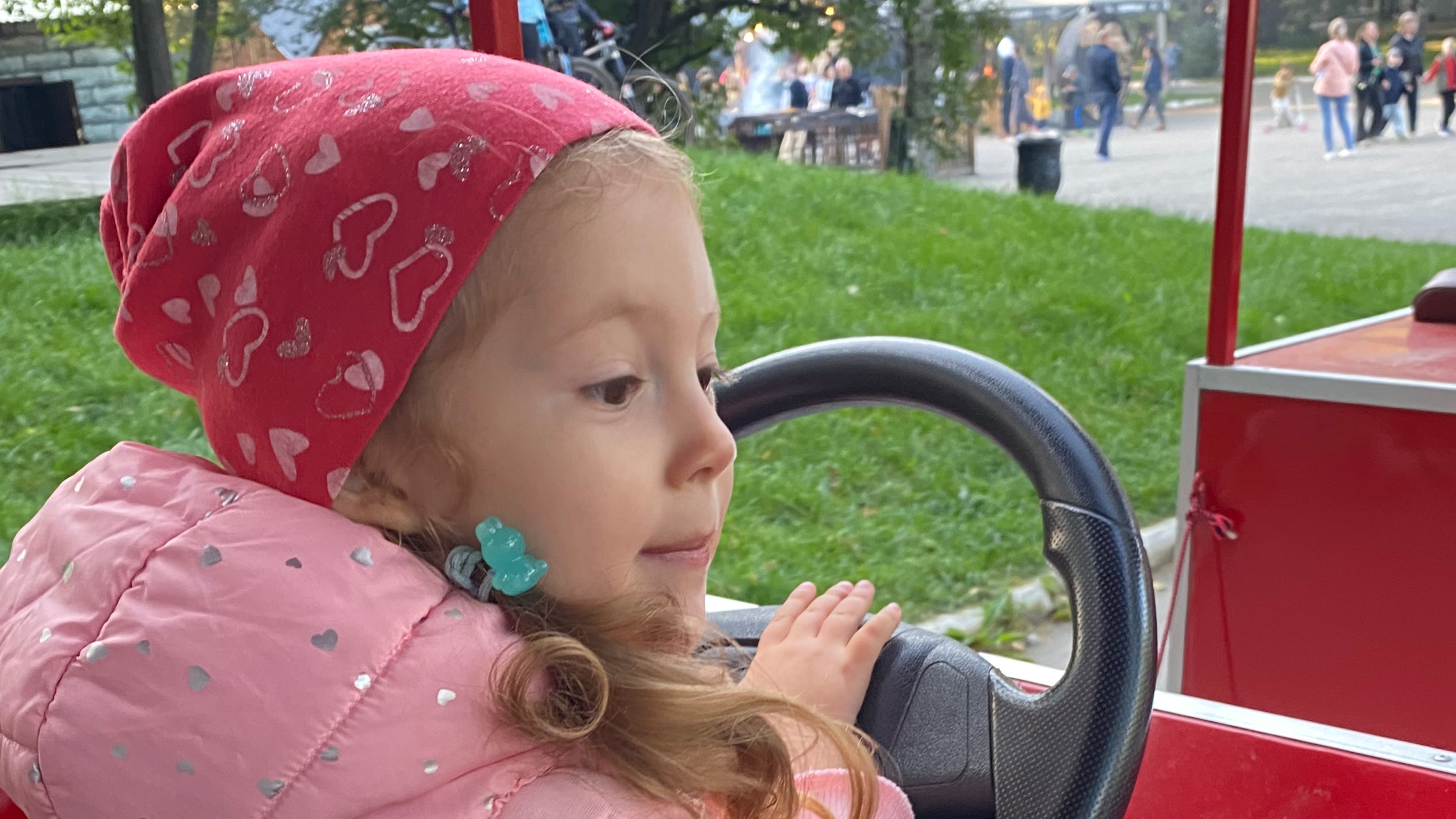 Мы с Ниной едем на паровозике кормить белок