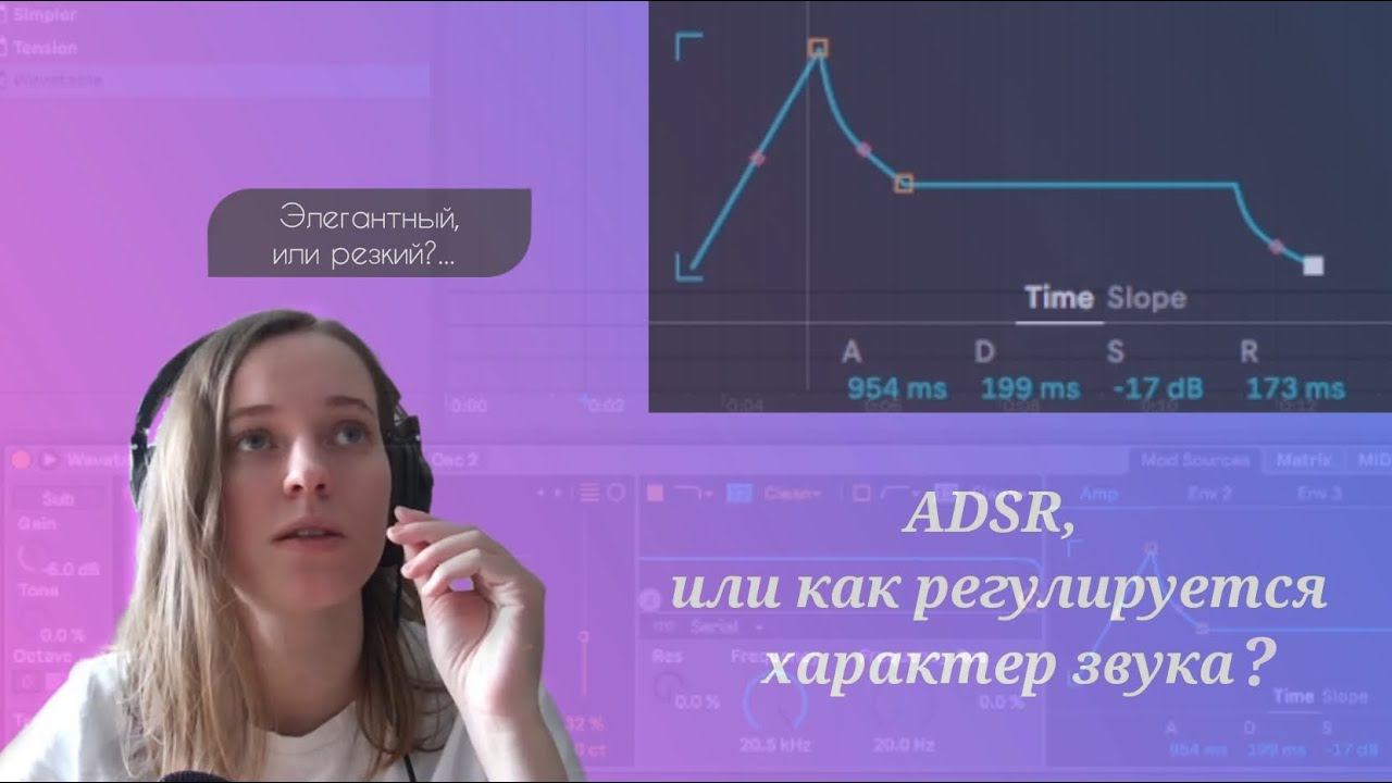 Какие параметры позволяют регулировать характер звука? Что такое ADSR? И как можно находить разные инструменты, используя только одну форму волны? 0:12 Как меняется характер звука в синтезаторе Wavetable в Ableton. 0:23 Что происходит со звуком после того, как он появился? 0:56 Что такое ADSR? 1:07 Параметр Attack 1:16 Параметры Decay и Sustain 2:02 Параметр Release 2:40 Как влияет attack на звук? Четкость и плавность 3:25 Как влияют decay и sustain? Стабильность и отрывистость 4:26 Release. Длина нот и переходы между ними. 5:14 Эффект аккордеона/баяна 5:38 Как сделать пэд элегантнее? 6:17 Параметры ADSR в Serum. Загадочная ручка Hold 7:11 Заключение