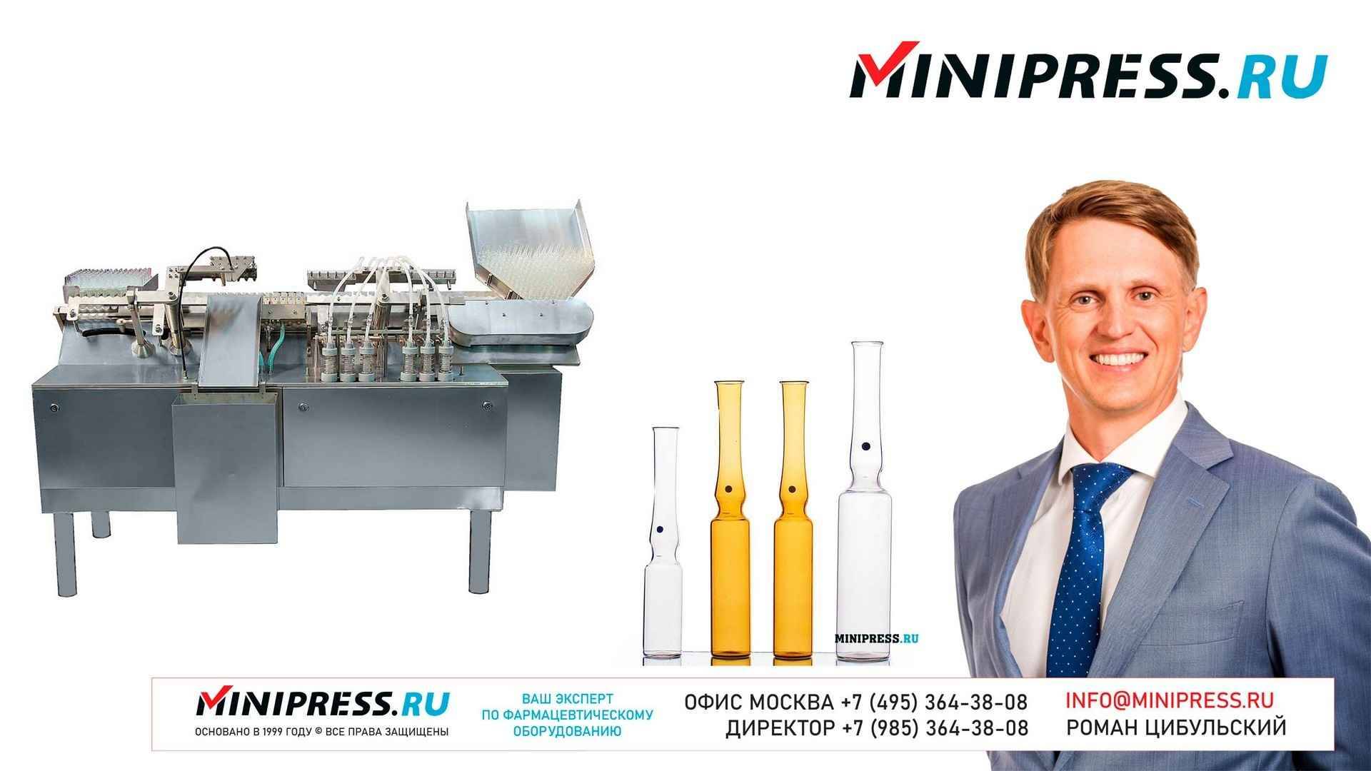 Автоматическая машина розлива и запайки стеклянных ампул ALG-02 https://Minipress.ru/katalog/ Фармацевтическое оборудование. Специалисты в фармацевтическом оборудовании и технологиях производства лекарств. Более 20 лет оказываем нашим клиентам помощь в выборе, поставке, наладке различного фармацевтического оборудования! Вы в поиске надежного поставщика оборудования? Мы предоставим вам лучший сервис 24/7. Собрана лучшая команда профессионалов в фармацевтической отрасли и налажены стабильные связи с лучшими производителями. Мы не только продаем, но и производим многие модели оборудования Директор компании Минипресс Роман Цибульский Поставка фармацевтического оборудования в Россию Пишите: info@minipress.ru Телефон +7(495)364-38-08; Мобильный +375(29)308-00-00 Россия, Москва Skype: RomanTsibulsky; ICQ: 310-134-490 Подписывайтесь на наш видео канал на Youtube https://youtube.com/user/wwwMinipressru Обновленный сайт https://Minipress.ru Каталог оборудования https://Minipress.ru/katalog/ МЫ В СОЦИАЛЬНЫХ СЕТЯХ G+ https://plus.google.com/+RomanTsibulsky/ FB https://facebook.com/roman.tsibulsky YOUTUBE https://youtube.com/user/wwwMinipressru IN https://ru.linkedin.com/pub/roman-tsibulsky/a6/933/661 БОЛЬШОЙ КАТАЛОГ ФАРМАЦЕВТИЧЕСКОГО ОБОРУДОВАНИЯ https://minipress.ru/katalog/ Постоянно обновляемый каталог различного фармацевтического оборудования с фотографиями, описаниями, видео и ценами. ПЕРСОНАЛЬНЫЙ МЕНЕДЖЕР 24 ЧАСА https://minipress.ru/katalog/ Вы общаетесь по всем вопросам, с момента первой консультации и до получения оборудования, с одним специалистом. СПЕЦИАЛИСТЫ И ТЕХНОЛОГИ https://minipress.ru/katalog/ Имеем обширные связи в фармацевтической среде, найдем любого специалиста, поможем с освоением оборудования и технологий. ОБСУЖДЕНИЕ ВАШИХ ИДЕЙ ПО ПРОИЗВОДСТВУ ПРОДУКЦИИ https://minipress.ru/katalog/ Поможем в оценке ваших идей. Большой опыт в организации различных производств и выпуске продукции. Ценные советы. ФАРМАЦЕВТИЧЕСКОЕ ОБОРУДОВАНИЕ Мы поставили перед собой задачу, помогать нашим клиентам в правильном выборе фармацевтического оборудования. Многолетний опыт подобной деятельности показывает, что многие клиенты сталкиваются, в первую очередь, с непониманием технологического процесса. Покупка оборудования должна быть финальной точкой после подробного обсуждения задачи, консультацией с производителем оборудования, отправкой сырья и материалов на фабрику, тестирования в работе. ДЛЯ ТАБЛЕТОК https://minipress.ru/katalog/category/farmacevticheskoe_oborudovanie/ Смешивание порошков, гранулирование, прессование, обеспыливание, покрытие оболочками, фасовка, упаковка, счет, нанесение логотипов ДЛЯ ЖЕЛАТИНОВЫХ КАПСУЛ https://minipress.ru/katalog/category/farmacevticheskoe_oborudovanie/kapsulyatory-dlya-tverdyh-zhelatinovyh-kapsul/ Фасовка порошков и масел, обеспыливание, счет и фасовка, упаковка, нанесение логотипов. ФАСОВКА И УПАКОВКА https://minipress.ru/katalog/category/upakovochnoe_oborudovanie/ Упаковка в пластиковые и стеклянные флаконы, блистер, фольгу, ламинированную бумагу, стеклянные ампулы, саше, стрипы, тубы, тюбики, контурную ячейку. ТЕХНОЛОГИЧЕСКОЕ https://minipress.ru/katalog/category/eksperimentalnoe-oborudovanie/ Лабораторное, аналитическое, подготовительное, отдельные машины и линии под ключ. СФЕРЫ ДЕЯТЕЛЬНОСТИ Наша компания занимается множеством направлений фармацевтического бизнеса! Предлагаем Вам посетить страницы нашего сайта https://www.Minipress.ru по различным специализациям. ОБОРУДОВАНИЕ ДЛЯ НАКЛЕЙКИ ЭТИКЕТОК НА БУТЫЛКИ АМПУЛЫ ФЛАКОНЫ https://minipress.ru/katalog/oborudovanie-s-otzyvami/oborudovanie-dlya-naklejki-etiketok-na-butylki-ampuly-flakony/ Автоматическое этикетировочное оборудование для этикеток на кле