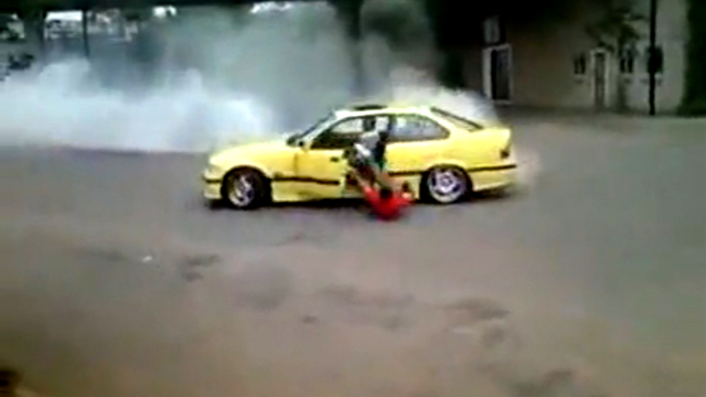 Парень решил показать классный дрифт,но не закрыл дверь автомобиля. Результат на лицо. Просто идиот.