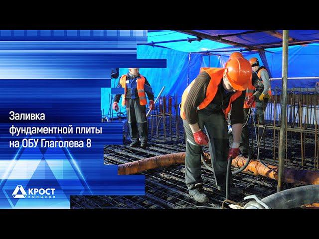 25 февраля на ОБУ Глаголева 8 началась заливка фундаментной плиты корпуса. В 7:05 утра был принят первый автобетоносмеситель, а в 20:00 26 февраля уложен последний бетон. Менее чем за 37 часов принят весь объем бетона, необходимый для создания фундамента, – 4500 кубометров. Высота фундаментной плиты составила 2,8 м, площадь 1630 кв. м. Предварительно в грунт были погружены 164 буронабивные сваи. Высота каждой сваи 28,5 метра, диаметр – 1,5 метра. При создании каркаса фундаментной плиты было использовано 550 тонн арматуры. Вязка арматуры заняла две недели. Работы по армированию и бетонированию фундамента выполняли 70 человек. Для организации бесперебойной подачи строительной смеси на фундаментную плиту корпуса на ОБУ Глаголева 8 установлены пять стационарных бетононасосов, уложено 700 м труб. Организована удобная площадка для подъезда автобетоносмесителей. В ходе работ по армированию и заливке фундаментной плиты отличились бригады Вячеслава Медовяка и Василия Поминчука. Все работы выполнены в кратчайшие сроки. Первый бетон – традиция, которую с удовольствием поддерживают строители. #КРОСТ#Глаголева 8#Первый бетон