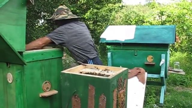 Переселение роя из ловушки в улей колоду.