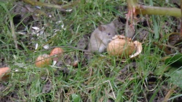 Мышка под дождём ест орешек