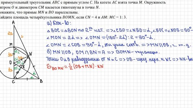 Дан прямоугольный треугольник с прямым углом . На катете взята точка . Окружность с центром и диаметром касается гипотенузы в точке . а) Докажите, что прямые и параллельны. б) Найдите площадь четырёхугольника , если = 4 и : = 1: 3.