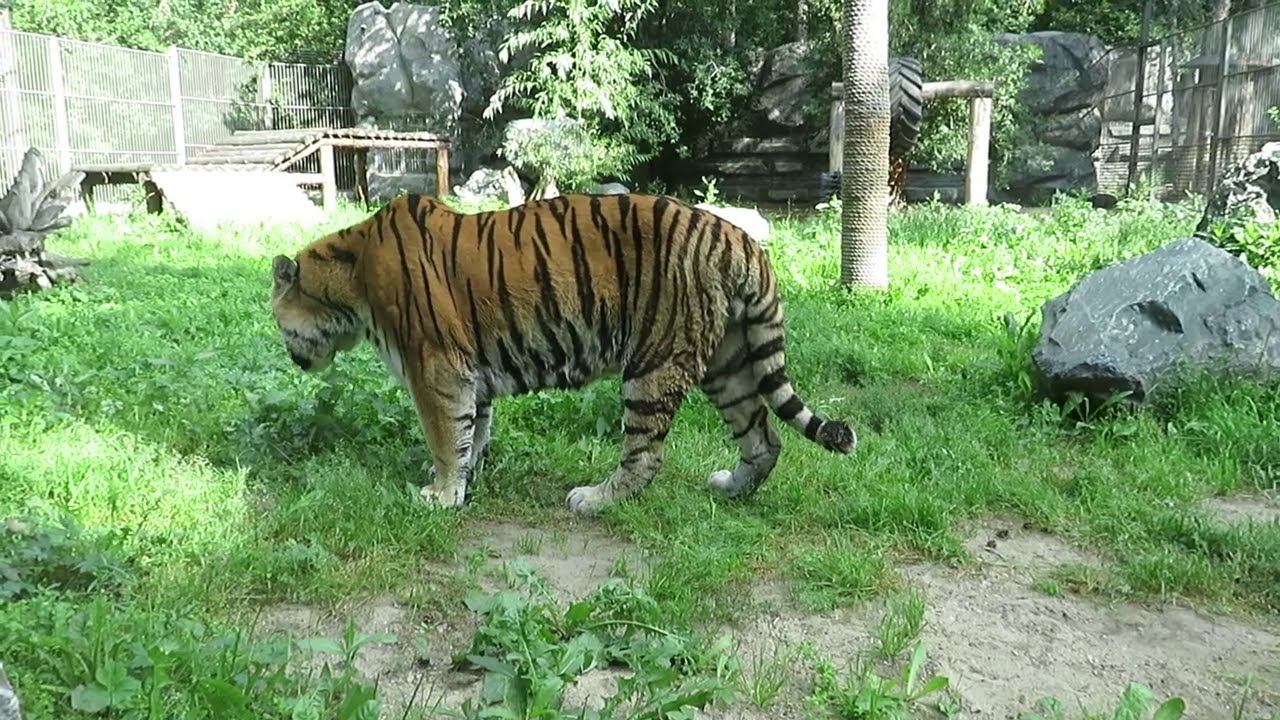 Амурский тигр Максимус обследует вольер Лапы, пока у него идёт уборка 09.08.2023