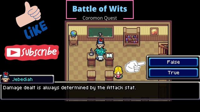 Coromon Quest - Battle of Wits Here is a list of all possible questions and their respective answers: Q: Fire is very effective against... A: Ice Q: Water is very effective against... A: Fire Q: Air is very effective against... A: Fire Q: Cut is very effective against... A: Electric Q: Ghost is very effective against... A: Ghost Q: Poison is very effective against... A: Normal Q: Normal is very effective against... A: Nothing Q: Sand is very effective against... A: Electric Q: How many types can be found in Velua? A: 13 Q: How many Coromon are currently known to exist in Velua? A: 118 Q: How many Potential value variations are there? A: 21 Q: Coromon of different Potential differ in appearance only. A: False Q: There are types which can only be found on Skills. A: True Q: Damage dealt is always determined by the Attack stat. A: False Q: The Speed stat of a Coromon determines its Critical hit chance. A: False Q: A trainer may carry only five Coromon at a time. A: False Q: A trainer may carry up to six Coromon at a time. A: True Q: Trainers may not catch Coromon owned by another trainer. A: True Q: A trainer challenges you to a battle. You... A: Accept If this video helped you, please support me: Thumb Up the video & Subscribe to the channel. #coromon #walkthrough #playthrough #coromonquests #coromonwalkthrough