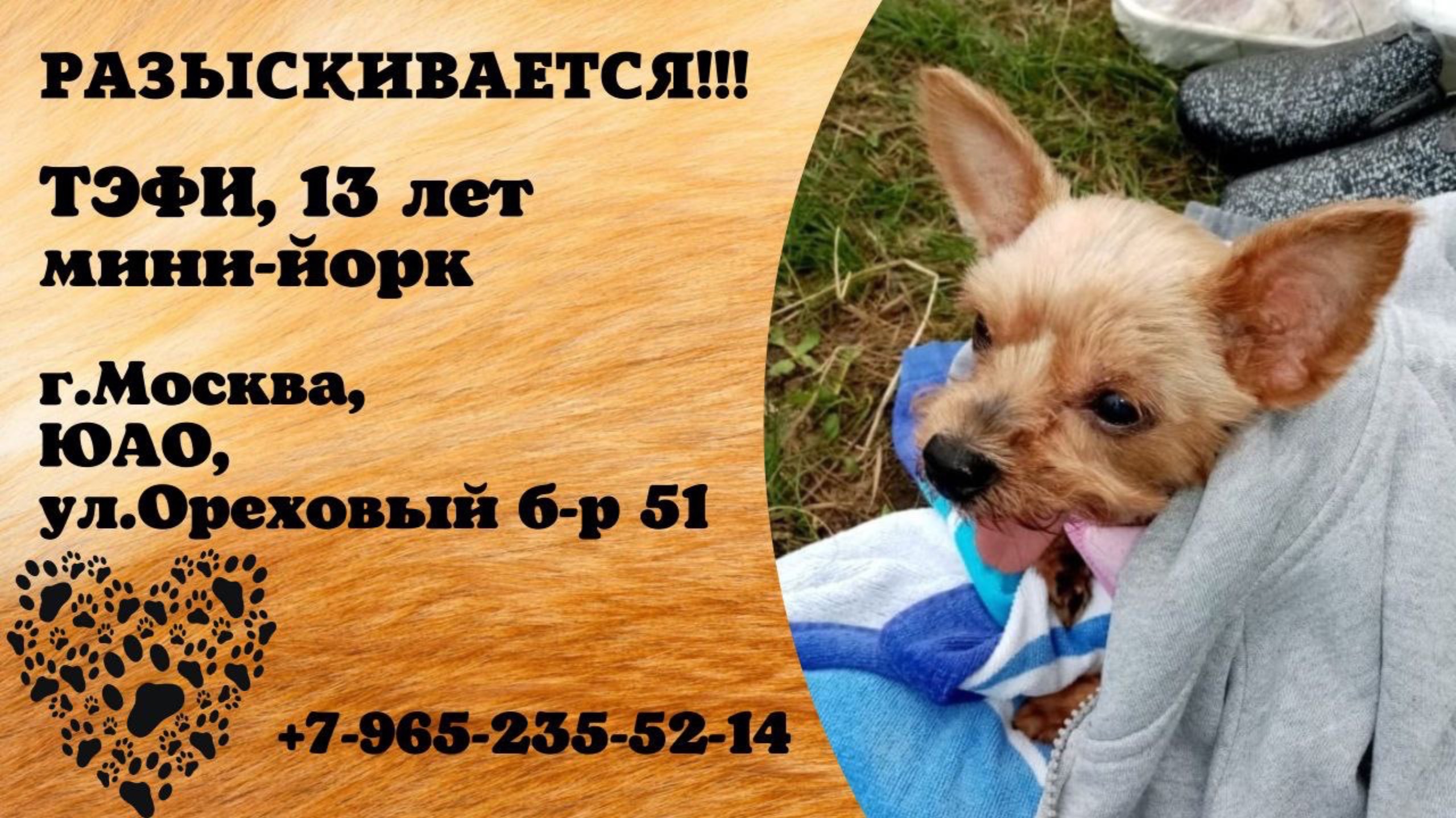 Московская Москва ЮАО Пропала собака 10.06 Пропала собака мини йорк девочка, старенькая, кличка Тэфи, 13 лет. Если кто видел напишите пожалуйста Собачка потерялась по адресу:Ореховый бульвар, дом 51 8(965)235-52-14 Виктория Инфо https://vk.com/wall-198815410_197432 #пропала_собака#московская#москва