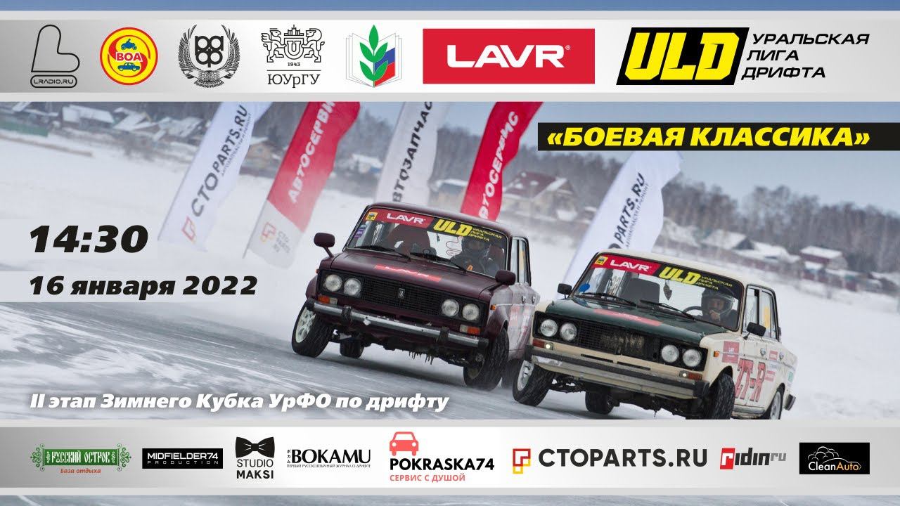 ❄ Едем дальше! Зимний Кубок УрФО по дрифту II этап: 15-16 января 2022 База отдыха «Русский остров» Яндекс.Карты https://yandex.ru/maps/-/CSxAefr Google Карты https://goo.gl/maps/ZH9CFK3EZcE2 ВХОД ДЛЯ ЗРИТЕЛЕЙ СВОБОДНЫЙ Смотрите бесплатную прямую трансляцию! Болейте за своих! youtube.com/uraldriftru 15 января (суббота) ТОП-32 класс «Анлим» 16 января (воскресенье) ТОП-32 класс «Боевая классика» Чтобы не пропустить, подпишись и жми колокольчик Начало трансляций в 14:30 по Уралу (12:30 по Москве) Расписание на оба дня одинаковое: 07:00 – 08:30 Регистрация участников 07:00 – 11:00 Техническая инспекция 08:30 – 09:00 Брифинг 1 09:00 – 11:00 Тренировки 11:00 – 11:20 Брифинг 2 11:30 – 13:30 Квалификация 13:30 – 14:00 Перерыв на обед 14:00 – 14:20 Брифинг 3 14:30 – 17:00 Парные заезды 17:00 – 17:30 Награждение Регламент на сайте uraldrift.ru Регистрация участников: https://forms.gle/cZcTV2dMmiEdLQqn6 Информация про тренировки: https://vk.com/uraldrift?w=wall-26774842_66321 ДРИФТ-ТАКСИ В дни соревнований гостей будут катать два автомобиля на специальной трассе. Стоимость: 1000₽ за 3 круга. КАРТИНГ На базе работает прокатный на картинг: 10 минут — 500₽ Генеральный партнер: LAVR - автохимия и автокосметика Официальный партнер: ctoparts.ru Музыкальный партнер: L-radio Партнеры: Pokraska74 Салон красоты в Челябинске STUDIO MAKSI Круглосуточная автомойка CleanAuto RIDIN | Автозвук BOKAMU M74 «MidFielder74» Prod. Марат Афлятунов Канал @M74Prod Подпишись! #ULD #УральскаяЛигаДрифта #uraldrift #РусскийОстров #Калды #lavr #lavr_avtohimia #лавррулит #лавр_автохимия #лавр #Дрифт #Bokamu #Lradio #studiomaksi174 #CleanAuto74 #DRIFT #RIDINru #ТазыВалят #M74Prod #MidFielder74 #ctoparts #Pokraska74 #autosport