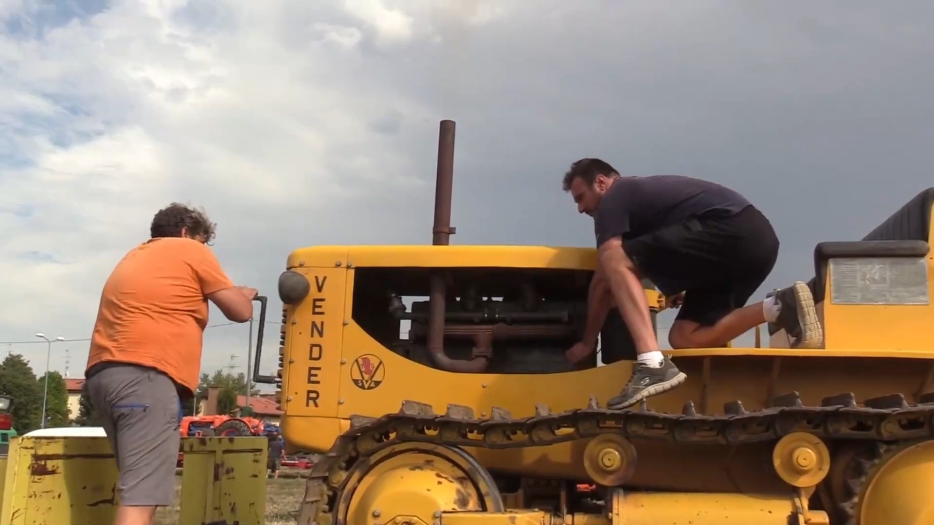 Дизельный трактор на гусеницах 1951 года, мощностью 95 л.с. Надежная техника пашет поле.