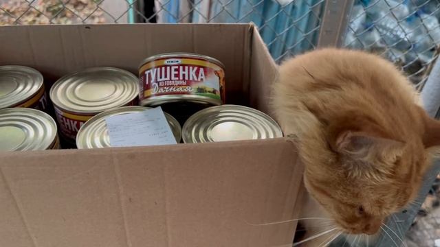 Котик приюта облюбовал коробку с тушенкой