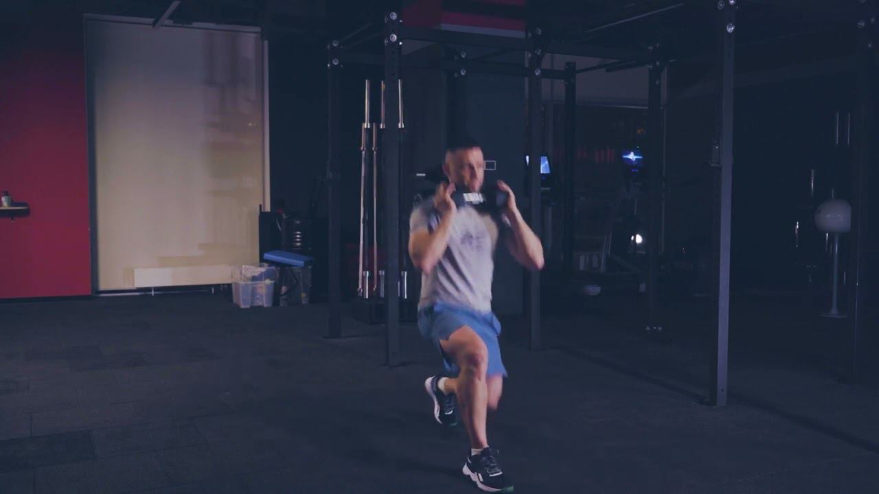 Попеременные выпады с гантелью на груди/ alternative DB front rack lunge