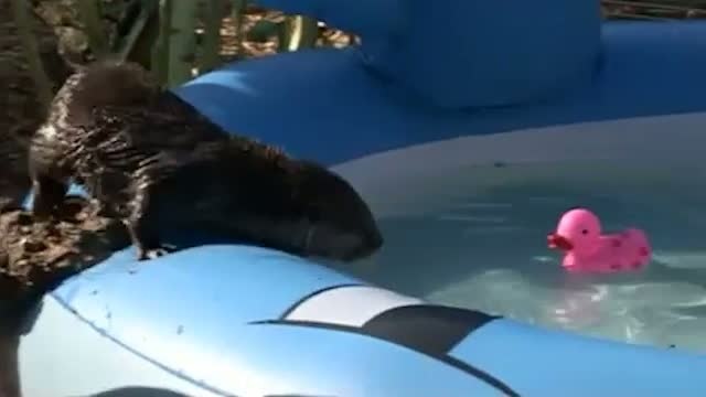 Два малыша выдры учатся плавать