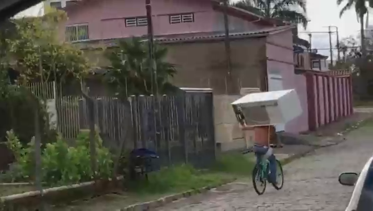 Очевидец заснял, как парень один сначала нес большой холодильник, а потом сел с ним на велосипед и поехал. #грузчики #холодильник #жесть #прикол