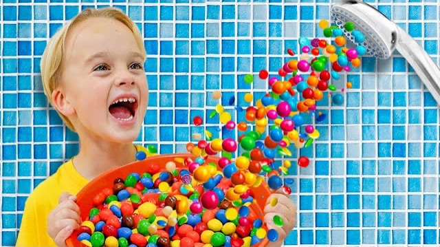 Крис и Алиса играют с волшебным конфетным душем