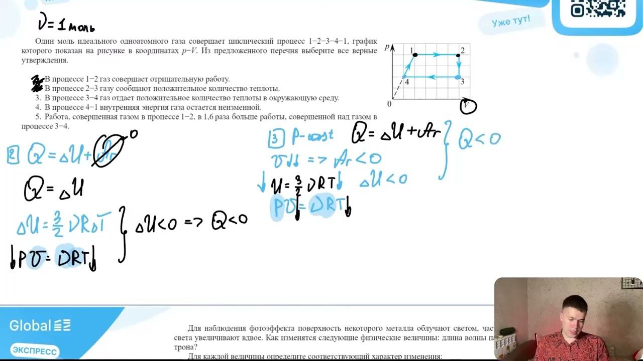 Один моль идеального одноатомного газа совершает циклический процесс 1-2-3-4-1, график которого - №