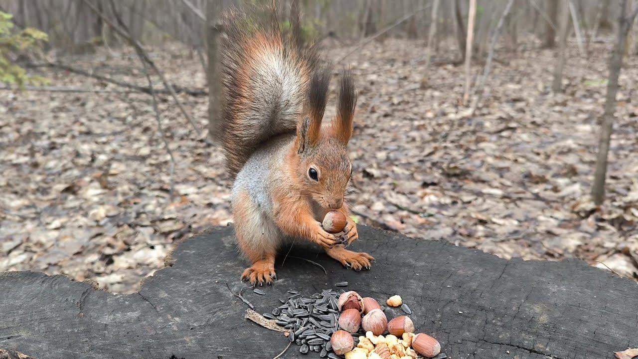 Рыжик закапывает орехи