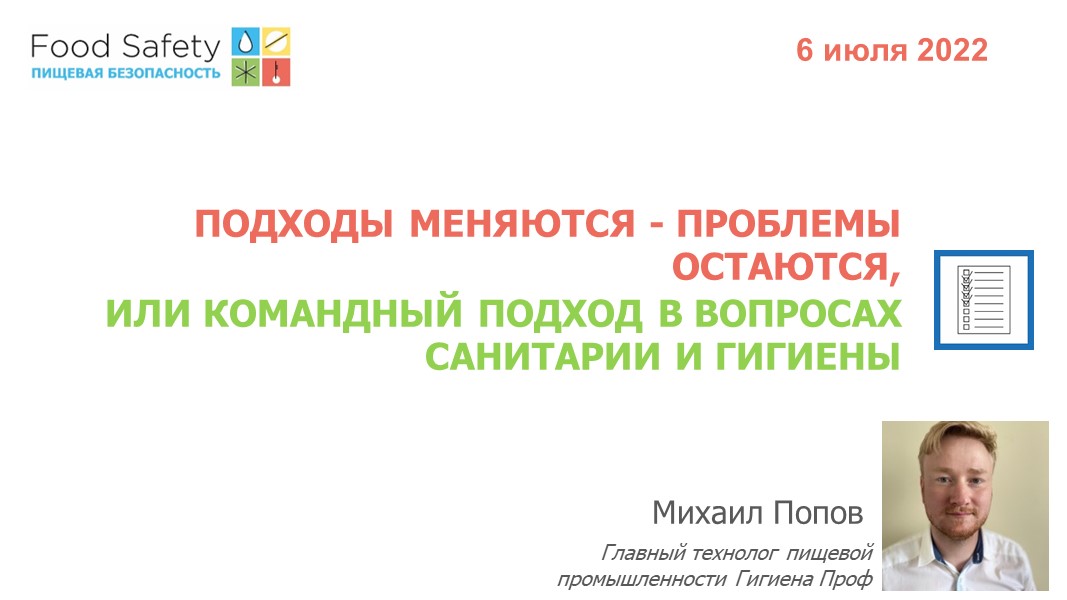 Михаил Попов, главный технолог пищевой промышленности «Гигиена Проф», рассказал, как правильно организовать взаимодействие отделов и служб производства, уделив особое внимание проблеме регулярного обучения персонала как фундамента для достижения высоких показателей гигиены. В своем выступлении он привел примеры аргументов для руководителей производства при выборе средств достижения общих целей выпуска безопасной продукции.
