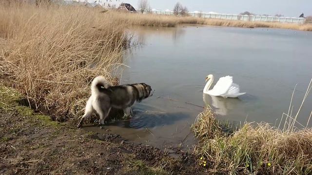 маламут Атом и лебедь