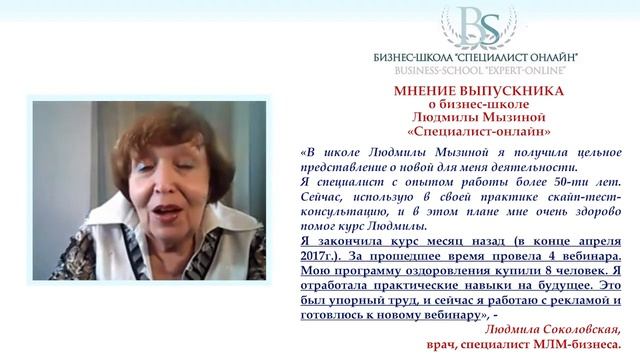 Мнение о бизнес школе Л.Мызиной "СПЕЦИАЛИСТ ОНЛАЙН" выпускницы Людмилы Соколовской