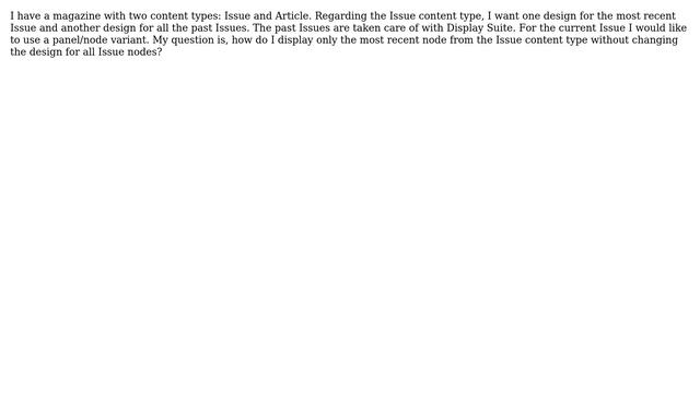 Drupal: How to display most recent node in different Panel? Helpful? Please support me on Patreon: https://www.patreon.com/roelvandepaar With thanks & praise to God, and with thanks to the many people who have made this project possible! | Content (except music & images) licensed under CC BY-SA https://meta.stackexchange.com/help/licensing | Music: https://www.bensound.com/licensing | Images: https://stocksnap.io/license & others | With thanks to user swtweb (drupal.stackexchange.com/users/10619), user node9 (drupal.stackexchange.com/users/9182), and the Stack Exchange Network (drupal.stackexchange.com/questions/46486). Trademarks are property of their respective owners. Disclaimer: All information is provided "AS IS" without warranty of any kind. You are responsible for your own actions. Please contact me if anything is amiss at Roel D.OT VandePaar A.T gmail.com
