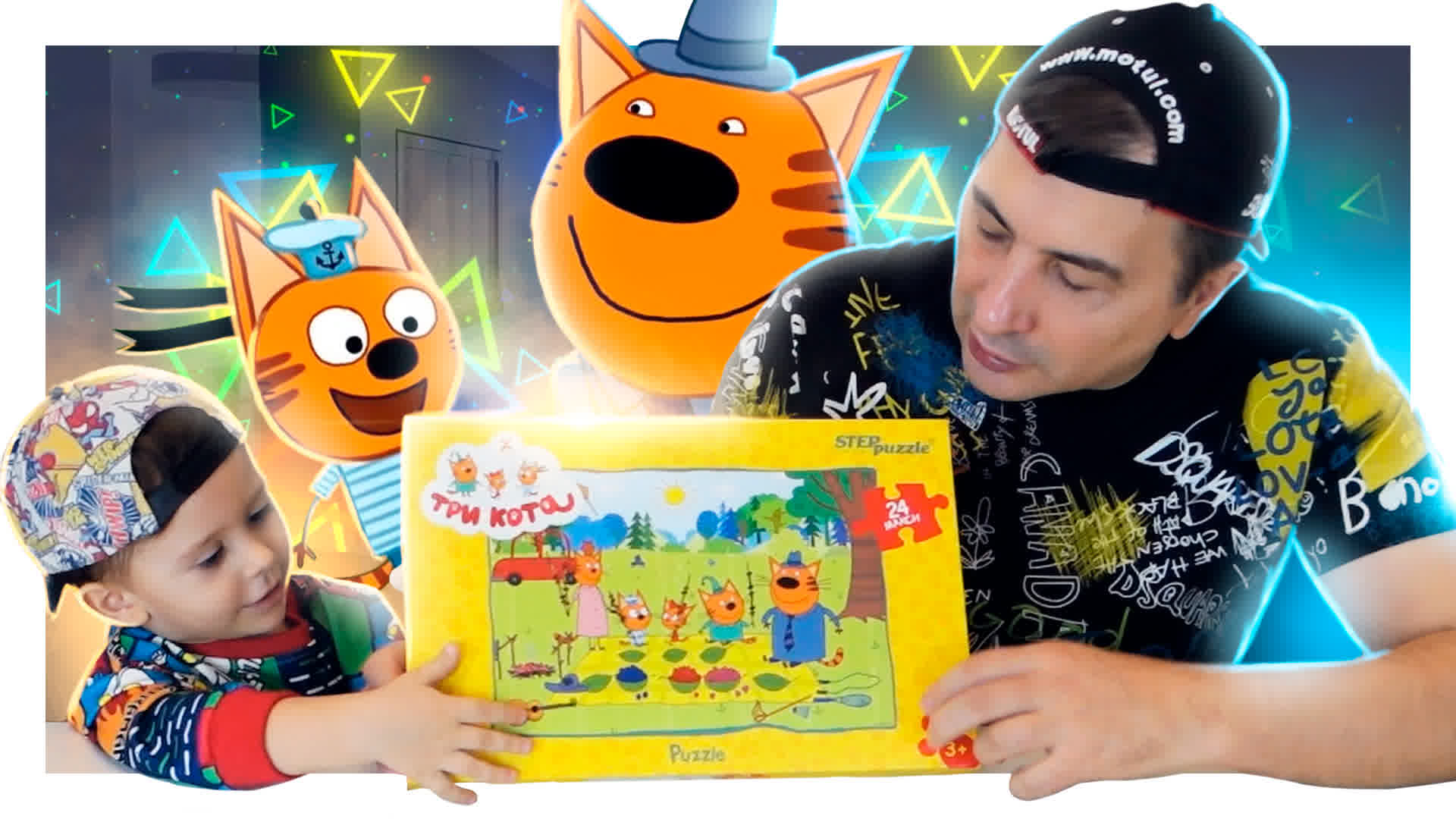 Три кота и вся семья! Трофимка и папа собирают картинку из деталей пазла. #дети #игра #трикота #пазл