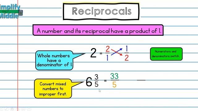 For a copy of the notes, vocabulary, and interactive activities, visit me at https://www.teacherspayteachers.com/Store/Simplify-The-Middle. This lesson explains what a reciprocal is and how to find it from a whole, mixed number, and fraction.