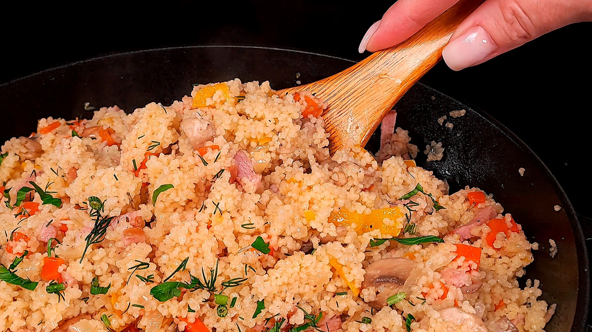 Что приготовить на ужин быстро и вкусно? Кускус с ветчиной и грибами на сковоре — рецепт за 15 минут