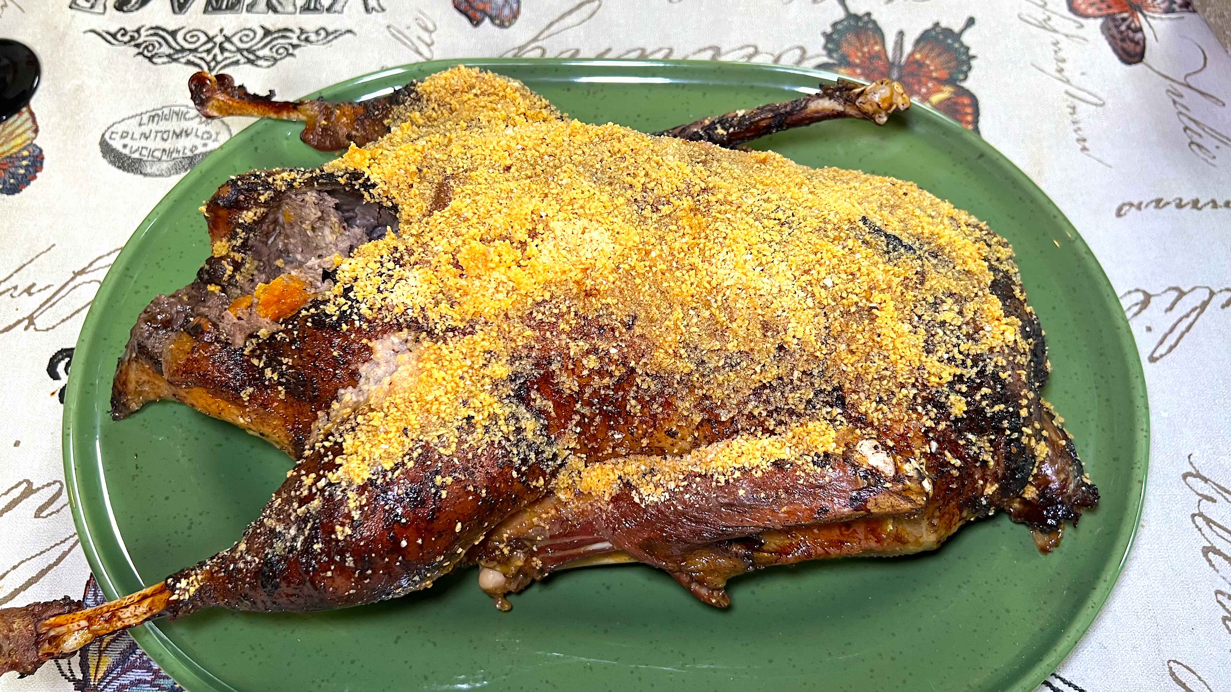 Нет страшнее кошмара для хозяйки … чем ожидающая своей участи тушка гуся в холодильнике утром 31-го декабря … в голове крутится миллион рецептов приготовления и выбрать тот самый, который удовлетворит изысканные вкусы приглашенных гостей очень сложно … приготовление гуся в духовке дело хлопотное и отчасти рискованное … поделюсь своим рецептом! Как всегда просто и вкусно … лук мелко порезать и обжарить на оливковом масле … добавить орегано, обжаренные и измельченные орехи … пекан, грецкий и фундук … добавить кураги … залить шампанским или вином … и потомить минут десять … в качестве начинки для гуся идеально подойдет свиной фарш … все перемешиваем и плотно набиваем гусиную тушку … апельсин добавит вкуса и красок … в форму для запекания засыпаем овощную подушку … на нее выкладываем заветную тушку … и смазываем смесью растительного масла, паприки, орегано и соевого соуса … закрываем фольгой и отправляем в духовку … 120°С час, 130°С час и 180°С 2 часа … медленный нагрев важен для равномерного прогрева птички … потом нужно убедиться термометром, что температура в толще птички превышает 74°С … снимаем фольгу … поливаем апельсиновым соком и припудриваем панированными сухарями … и снова в духовку до золотистой корочки … после того как волшебные ароматы вскружат вам голову не остается ничего как выпустить жар-птицу из раскаленной клетки … под брызги шампанского и новогодний бой курантов … я уверяю … гости может и забудут деда Мороза, Снегурочку, выступление Президента … но вкус вашего зажаристого гуся будут помнить весь год … и будьте осторожней … за сказочную птицу будет настоящая борьба … с ножами … и вилками!))) Приятного аппетита!
