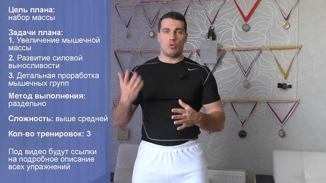 ТРЕНИРОВКА 1 : грудь и спина Разминка 5-10 минут https://www.youtube.com/watch?v=AqpyR6vQvj0 1. Подъём ног в висе 3х10-15 https://www.youtube.com/watch?v=B59MMvDpa2g 2. Гиперэкстензия 3х10-15 https://www.youtube.com/watch?v=b5xKWsrAjxM 3. Становая тяга с гантелями 4-5x8-12 https://www.youtube.com/watch?v=ugkSLm4_XmU 4. Тяга штанги в наклоне обратным хватом 4х8-15 https://www.youtube.com/watch?v=Fv4-fiwGGVA 5. Тяга за голову с верхнего блока 3-4х8-12 https://www.youtube.com/watch?v=3oGFh9Qodpg 6. Тяга горизонтального блока 3-4х8-12 https://www.youtube.com/watch?v=eLq8RGaHtJE 7. Жим штанги лёжа классический 4-5x8-12 https://www.youtube.com/watch?v=XUeE5cTzsfo 8. Жим гантелями лёжа под углом 30 гр. 3x12-15 https://www.youtube.com/watch?v=fB2oVB4XeI8 9. Сведение рук в тренажёре "бабочка" 3х10-15 https://www.youtube.com/watch?v=eOxRFx8LBng Заминка (не обязательно) 2-5 минут https://www.youtube.com/watch?v=yM8WRIYeczA Подробнее про этот план: https://tvoytrener.com/metodiki_obhcie/trenirovki_devushki.php Скачать этот план: https://tvoytrener.com/dlia_pechati/trenirovki_devushki2.docx Тренировка 2 https://www.youtube.com/watch?v=OHoe5fxqRto Тренировка 3 https://www.youtube.com/watch?v=chOaOh249Dc Цель плана: набор массы Задачи плана: 1. Увеличение мышечной массы 2. Развитие силовой выносливости 3. Детальная проработка мышечных групп Методы выполнения: раздельно Сложность – выше средней Что значит раздельные тренировки? Это значит, что вы будете разделять группы мышц по тренировкам. В данной программе вы будете тренировать по 2 группы мышц за одно занятие. То есть не всё тело, а только одну его определённую часть. Такой метод разделения упражнений больше по нраву мужчинам. Так как он неплохо растит мышечную массу. Но некоторые девушки тоже любят так тренироваться. Одни для набора массы. А другие для придания телу лучшего рельефа (если сочетать такие тренировки с аэробными нагрузками). Этот стиль не совсем подходит новичкам. Так как упражнения на одну группу мышц идут блоком (по несколько подряд). И нужно быть достаточно тренированным, чтобы выдержать такую ударную нагрузку. Создавая этот комплекс, я учёл, что девушки больше заинтересованы в тренировке нижней части тела. Поэтому, все упражнения на руки я поместил в одну тренировку. И вот что из этого получилось: