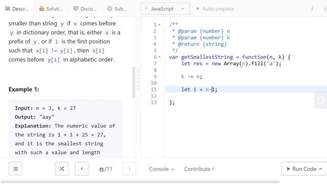 https://leetcode.com/problems/smallest-string-with-a-given-numeric-value/ JavaScript Solution of LeetCode Problem With Explanation