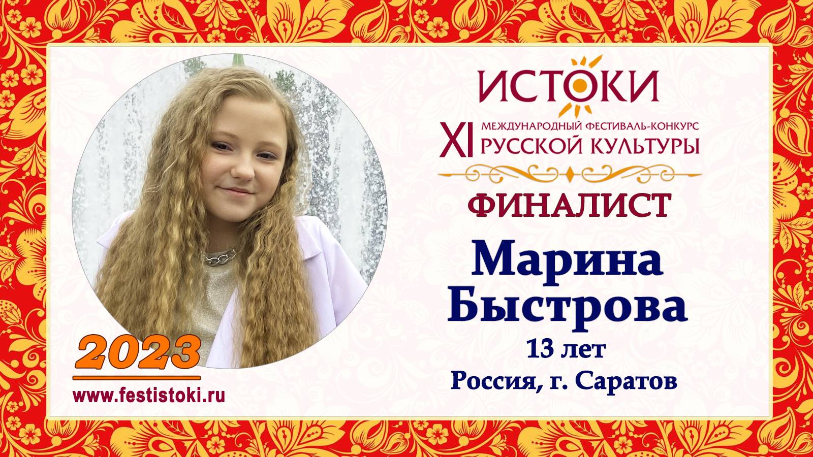 Участник Вокального конкурса по определению Обладателя Гран-При и Суперфиналистов XI Международного фестиваля-конкурса русской культуры «Истоки» среди Лауреатов I степени онлайн-конкурсов 2022-2023гг. Россия, г. Москва 5-6 декабря 2023г. Сайт: www.festistoki.ru / www.festistoki.com E-mail: festistoki@mail.ru https://t.me/festistoki