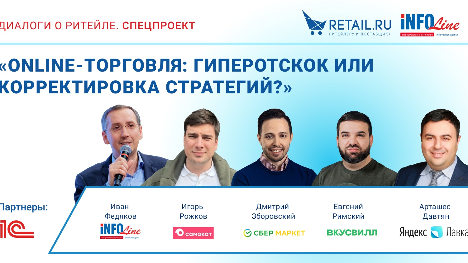 19 мая 2022 года в 11:00 ведущее агентство бизнес-аналитики INFOLine и отраслевой портал Retail.ru проведут онлайн-конференцию «Online-торговля: гиперОТСКОК или корректировка стратегий?» в рамках спецпроекта «Диалоги о ритейле». Модераторами встречи выступят генеральный директор INFOLine Иван Федяков и руководитель проекта Retail.ru Наталья Марова. Ключевые вопросы и темы, которые мы предлагаем обсудить в новом эфире 19 мая: · Динамика рынка онлайн-торговли после 24.02.2022 г. · Особенности и поведенческие паттерны аудитории весной 2022 года. · Смена бизнес-модели развития компаний рынка e-grocery. · Бесплатная доставка – дело прошлое? · Ставка на СТМ: текущие вызовы в производстве и прогнозы. · Региональные тенденции: e-grocery уходит из регионов. Свое участие в конференции подтвердили: · Игорь Рожков, директор по маркетингу сервиса «Самокат», · Евгений Римский, управляющий по качеству и закупкам «Вкусвилла», · Дмитрий Зборовский, вице-президент по аналитике и эффективности «СберМаркета». · Арташес Давтян, коммерческий директор «Яндекс.Лавка» Предыдущее мероприятие этого цикла прошло в августе 2021 года, было посвящено новым лидерам e-grocery и их стратегиям и собрало рекордное число просмотров на каналах YouTube и Retail.ru. Запись конференции и вышедшие материалы можно посмотреть по ссылке https://clck.ru/hC9S8 . Партнер онлайн-встречи — фирма «1С» и сервис 1С:Курьер Для получения дополнительной информации о мероприятии и решения прочих вопросов можно обратиться к организаторам: · INFOLine: pr@advis.ru, +7 (495) 772-76-40 и +7 (812) 322-68-48 (доб. 405) · Retail.ru: MarovaNatalya@retail.ru, +7 (903) 226-76-64. Для того, чтобы получить итоговые материалы, необходима регистрация https://clck.ru/WeEMF Ваши вопросы к спикеру вы можете направить заранее на адрес events@retail.ru или задать во время встречи в комментариях к трансляции на наших каналах.