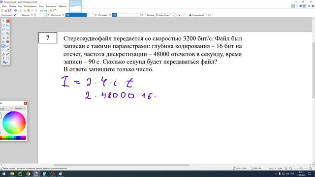 Стереоаудиофайл передается со скоростью 3200 бит/с. Файл был записан с такими параметрами: глубина кодирования – 16 бит на отсчет, частота дискретизации – 48000 отсчетов в секунду, время записи – 90 с. Сколько секунд будет передаваться файл? В ответе запишите только число.