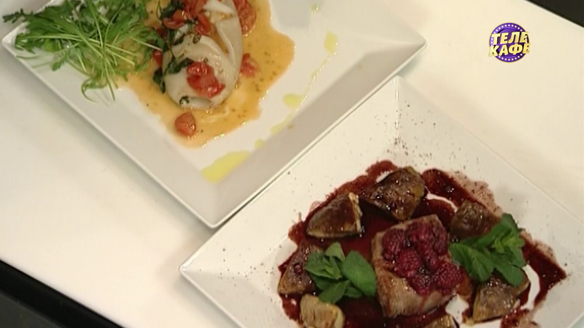 Фаршированные кальмары по-сицилийски / Говяжья вырезка с белыми грибами и малиной