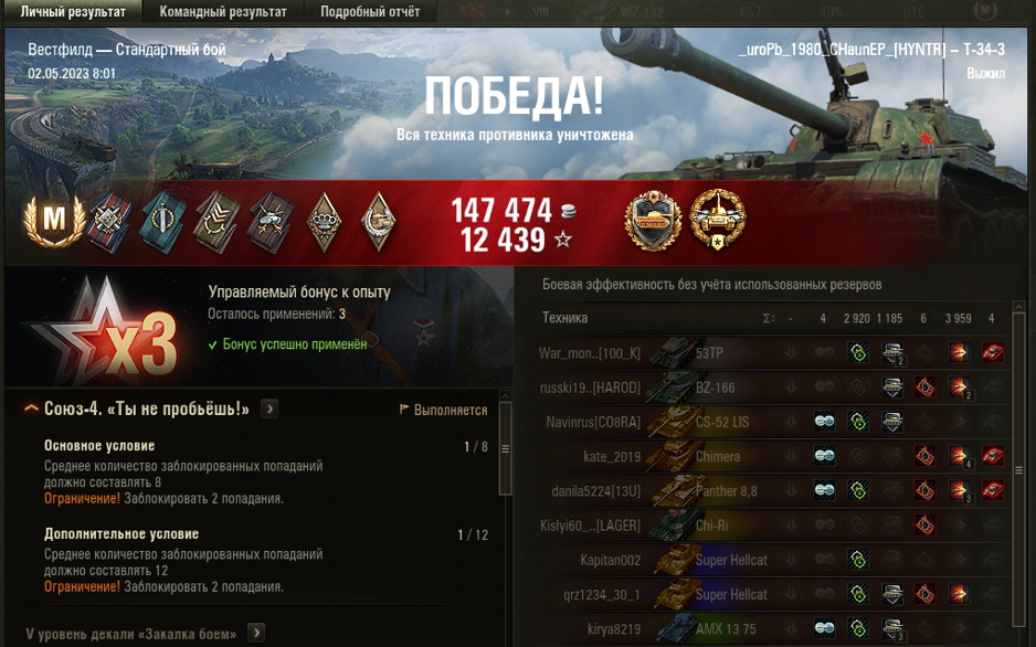 ВЕСТФИЛД МАСТЕР на Т-34-3 ОПЫТ: 1626 СУММАРНЫЙ УРОН: 6879 медали СТАЛЬНАЯ СТЕНА и КАЛИБР