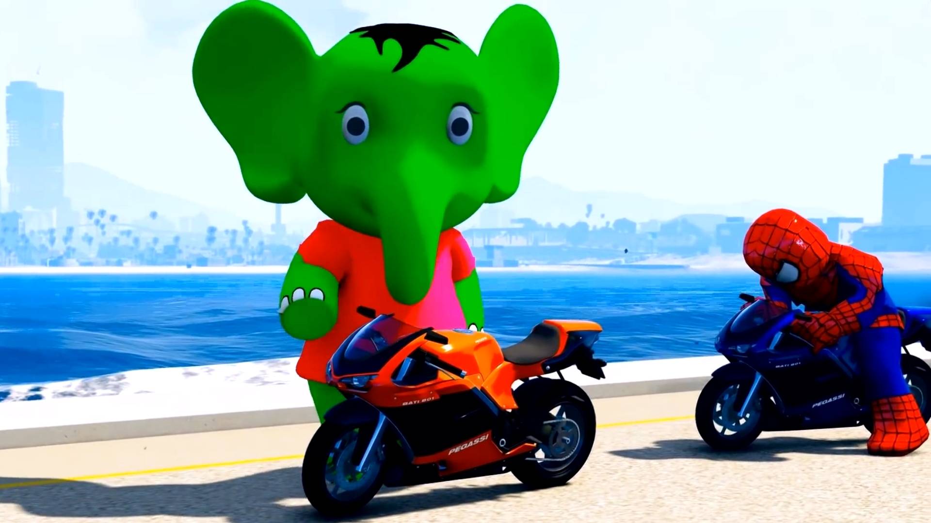 Приключения Человека-паука Веселые гонки на мотоциклах с Зеленым Слоником Мультфильм для детей