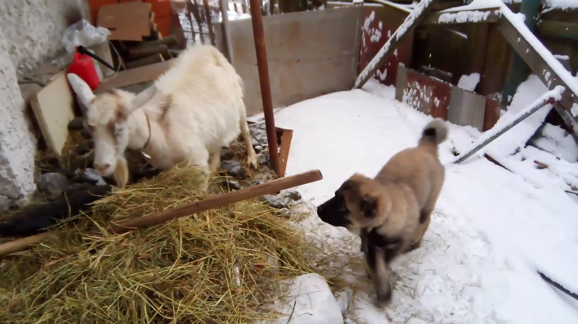 Смешной щенок против козы