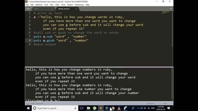 Hi, welcome. In this video, I'm going to teach you step by step how to write a program in Ruby. this ruby tutorial is for beginners. this program will show How to write a program for replacing words in the text with the use of sub and gsub. I use Sublime text editor.
