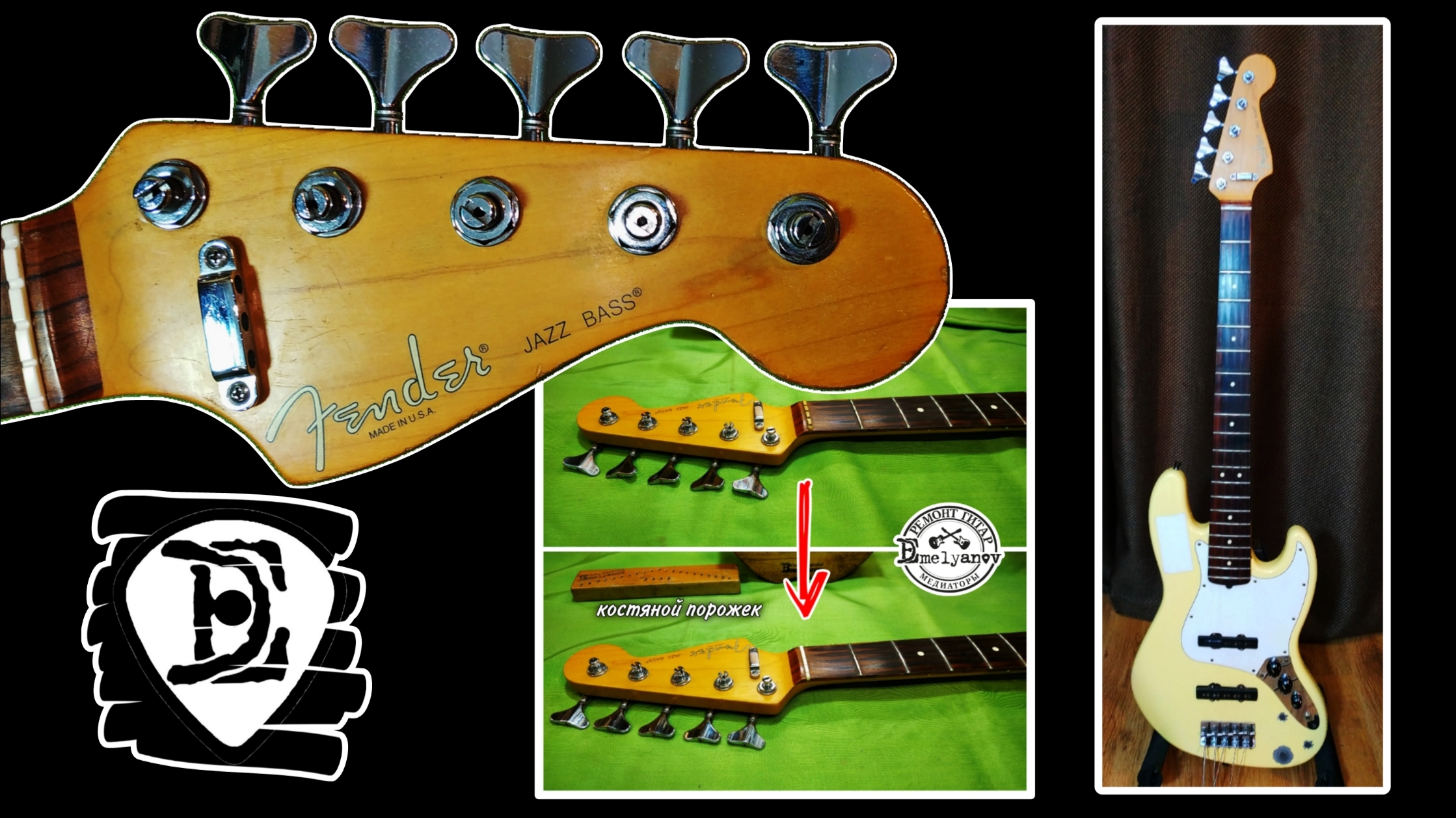 Fender JazzBass USA для аренды. Костяной порожек, обслуживание. Fender JazzBass USA, который предоставляется в аренду музыкантам для выступлений. Была проблема с регулировкой анкера. Пулю выкрутили и обнаружили несколько трещин. Пуля была смазана и вкручена до упора, гриф изогнулся. После установки струн выяснилось, что с отрегулированным прогибом открытые струны бились об первый лад, то есть необходимо было менять порожек. ✓ Изготовлен костяной порожек. ✓ Установлены пружинящие губки под звукосниматель, для регулировки высоты звукоснимателей. ✓ Прочие доработки. ✓ Отстройка гитары в прямом эфире Здоровья вашим гитарам и меньше поводов обращаться в ремонт✌️😉🎸 🔥🔥🔥🔥🔥 На сайте http://strunki.ru при оформлении заказа используйте промокод DEmelyanov и получите скидку @strunki.ru 🔥🔥🔥🔥🔥 #РемонтГитар #DEmelyanov #ремонтгитары #guitarservice #guitarrepair #Калининград http://DEmelyanov.ru http://vk.ru/DEguitars https://t.me/DEguitars http://dzen.ru/demelyanov?donate=true http://instagram.com/DEmelyanov http://fb.com/DEmelyanov http://youtube.com/DEmelyanov http://g.page/DEmelyanov
