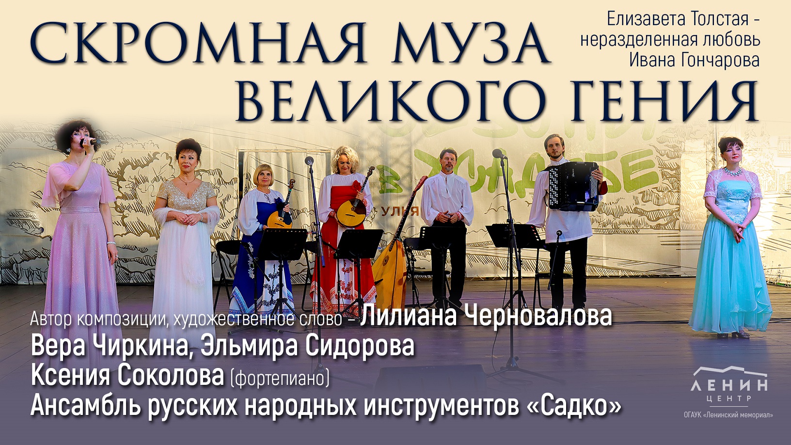 Музыкально-литературная композиция о Елизавете Толстой - неразделенной любови Ивана Гончарова Автор композиции, художественное слово – Лилиана Черновалова Заслуженная артистка России Вера Чиркина (сопрано) Эльмира Сидорова (сопрано) Юлия Корсакова (сопрано) Ксения Соколова (фортепиано) Ансамбль русских народных инструментов «Садко» Михаил Глинка (1804 – 1857). Ноктюрн «Разлука» Александр Алябьев (1787 – 1851), слова - А. Бистром . «Я вижу образ твой» Александр Грибоедов (1795 – 1829). «Вальс» Александр Гурилёв (1803 – 1858), слова - Петр Вяземский (1792 – 1878). «Радость-душечка» (Дуэт) Михаил Глинка (1804 – 1857), слова - Сергей Голицын (1803 – 1868). «Скажи, зачем» Винченцо Беллини (1801 – 1835), либретто Феличе Романи (1788 – 1865). Ария «Casta Diva» из оперы «Норма» Михаил Глинка (1804 – 1857), слова - Александр Пушкин (1799 – 1837). «Я здесь, Инезилья…» Петр Булахов (1822 – 1885), слова неизвестного автора. Романс «И нет в мире очей» Слова и музыка - Татьяна Котляревская (1862 – 1918). «Мираж» Владимир Коровицын (род. 1955). «Мелодия дождей» Александр Шиловский (1870 – 19??), слова - Константин Романов (1858 – 1915). «Я люблю тебя, как солнце» Юрий Весняк (род. 1957). «Пастораль» Михаил Глинка (1804 – 1857), слова - Александр Пушкин (1799 – 1837). «Я помню чудное мгновенье…»