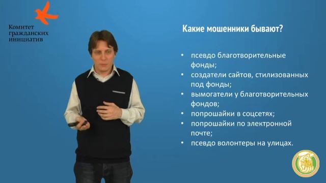 Юрий Белановский - руководитель Добровольческого движения «Даниловцы». http://www.danilovcy.ru/ Обучающий семинар (часть четвертая) в Комитете гражданских инициатив. Тема: «Как распознать мошенников, обманщиков, аферистов среди благотворительных и волонтёрских организаций и фондов? Что же делать?». Какие мошенники бывают: 1. псевдоблаготворительные фонды 2. создатели сайтов, стилизованных под фонды 3. вымогатели у благотворительных организаций 4. попрошайки в соцсетях 5. попрошайки по электронной почте 6. псевдоволонтёры на улицах Мошенники, если ОТКАЗЫВАЮТСЯ: 1. доказать, что организация некоммерческая 2. предоставить полное официальное название 3. интернет-сайт 4. копии уставных документов 5. контакты ответственных лиц 6. годовой бухгалтерский отчёт 7. назвать свои полные ФИО 8. показать свои документы 9. обосновать и документально подтвердить просьбу о помощи 10.предоставить счёт в банке, открытый на имя благотворительной организации или в крайнем случае на имя просителя 11.предлагают только номера электронных кошельков или номера мобильных телефонов 12.объяснить, как и на что будут потрачены деньги 13.объяснить, как можно удостовериться, что результат достигнут, что деньги были потрачены по назначению 14.принять не деньги, а те вещи, продукты, лекарства, о которых просят 15.собирать пожертвования в опломбированные ящики (даже в обмен на картинки, браслетики и прочее). Ящики вскрываются только специальными комиссиями, о чем составляется специальный акт Мошенникам также не нужны контакты специалистов или профильных организаций.