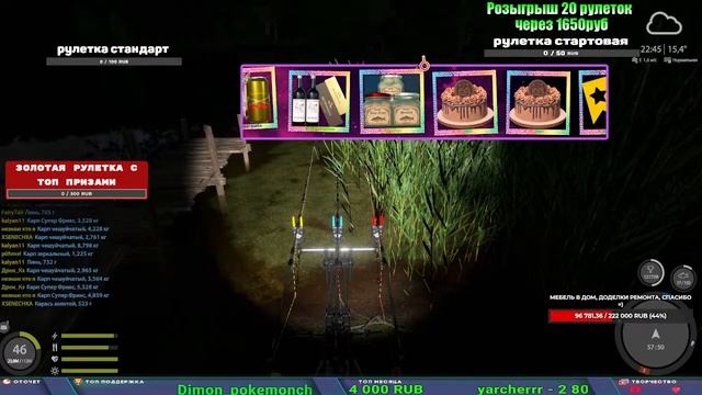 Поддержка донатом https://www.donationalerts.com/r/kalyamba11 Альтернативный донат https://new.donatepay.ru/@1032463 Если стрим лагает,смотри стрим на трово https://trovo.live/s/Kalyamba_na_Ribalke Мой ВК - https://vk.com/kalyantv НИК в игре kalyan11 НАШ ДИСКОРД СЕРВЕР https://discord.gg/mSbnTJK8TB Заказ водоема на 1 час - 500р ( весь стрим 2500р ) Модерка на канале 1200р ( каждая следующая на 100р больше) Озвучка доната на 40р,50р,100р,200р,300р,500р,1000р ✅Призы в рулетке "ЗОЛОТАЯ" ✔ ЗОЛОТО ✔ ПРЕМ ✔ КАТУШКИ РАПТОР 40, АЗИМУТ 10000, СИЛЬВЕР 80, ТАЙГА с 30 ✔ ПАЛКИ ПИЛКЕРНАЯ, ДОНКА МОРСКИЕ, ✔ РОД ПОД, СТУЛЬЯ ✅Призы в рулетке СТАНДАРТ : ✔ катушка "РАПТОР 40" ✔ катушка "АЗИМУТ 10000" ✔ катушка "ТАЙГА С30, С40," ✔ катушки 60 для медного ( ЭВИИ, НАТОРЫ, ГОЛДА, и тд) ✔ ПИЛКЕРНОЕ УДИЛИЩЕ КОРОЛЕВА ОКЕАНА ✔ Морское Донное удилище ✔ прем ( 3, 7, 30 дней) ✔ золото ( 1, 3, 5, 10, 20 ,50) ✔ билет на море ( 1, 3, 5 дней) ✔ голд наживка и др. ✅Призы в рулетке "СТАРТОВАЯ" ✔ катушка "silver80" ✔ катушка "БЕЛЫЙ КАЛИБР" ✔ катушка "Черный калибр" ✔ катушка "Протон" ✔ катушка "Нарга 6000" ✔ Набор Фидерист и спинингист ✔ Карповик Фортуна ✔ фидерные удилища ✔ прем, золото, алкашка, наживки и тд P.s Рулетка это не казино, а награда за поддержку стримера. Вечный ТОП ПОДДЕРЖКИ (11.05.2024) 1. Dimon_pokemonchik 119 784 2. Interceptor 75 508 3. Skreb79 71 261 4. une personne 68 619 5. Нарвал77 31 550