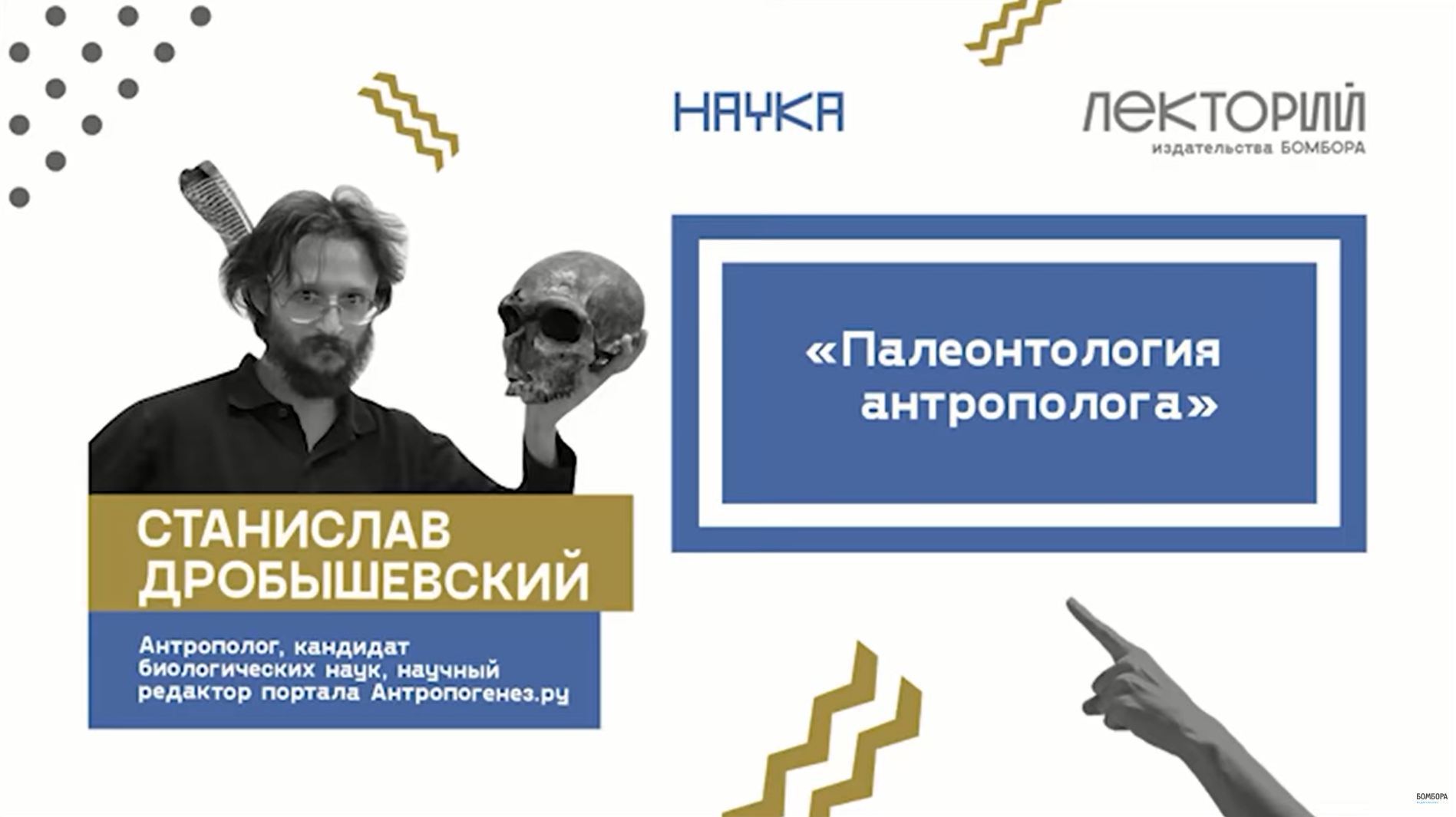 Купить книгу «Палеонтология Антрополога» по которой велась лекция: https://bombora.ru/book/46755/ Что, если жизнь на нашей планете появилась совершенно случайно? В результате редких мутаций клеток, движения материков или происшествий в соседних галактиках? Что знают ученые о том, что происходило на Земле миллионы лет назад? Перенесемся на тысячи лет назад, чтобы понять как зарождалась жизнь на Земле и от кого на самом деле произошел человек. Как нам удалось стать многоклеточными существами, и почему это не получилось у простейших существ. Станислав Дробышевский — антрополог и популяризатор научного мировоззрения. Кандидат биологических наук, доцент кафедры антропологии биологического факультета МГУ им. М. В. Ломоносова. Научный редактор портала Антропогенез.ру. Автор ряда учебных пособий для студентов, публикаций в периодических научных изданиях и научных монографий. Автор книги «Палеонтология антрополога». Узнать больше о Лектории Бомборы: https://bombora.ru/lectorium/