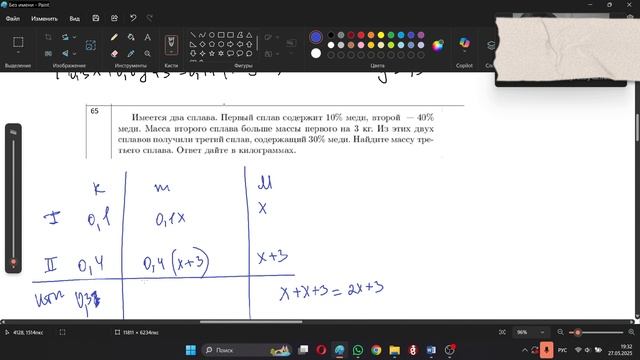 Имеется два сплава. Первый сплав содержит 10% меди, второй — 40% меди. Масса второго сплава больше массы первого на 3 кг. Из этих двух сплавов получили третий сплав, содержащий 30% меди. Найдите массу третьего сплава. Ответ дайте в килограммах.