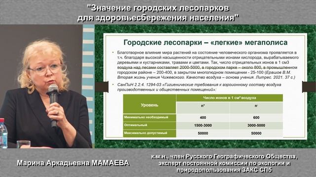 Член Русского Географического Общества, эксперт постоянной комиссии по экологии и природопользованию ЗАКС СПб Марина Аркадьевна Мамаева выступила с посланием человечеству: "Значение городских лесопарков для здоровья сбережения населения". В своем выступлении она обратила внимание на значение городских лесопарков на здоровье людей, и прежде всего, детей. Еще А.Л. Чижевский, основатель гелиобиологии и исследователь воздушного электричества, акцентировал своё внимание на значение электронного дефицита. Воздух для нас - это жизненно важная субстанция, гораздо важнее пищи и воды. А детская заболеваемость - это критерий благополучия региона в стране. Если из года в год растёт детская заболеваемость, то с регионом нужно что - то делать иначе, беда!