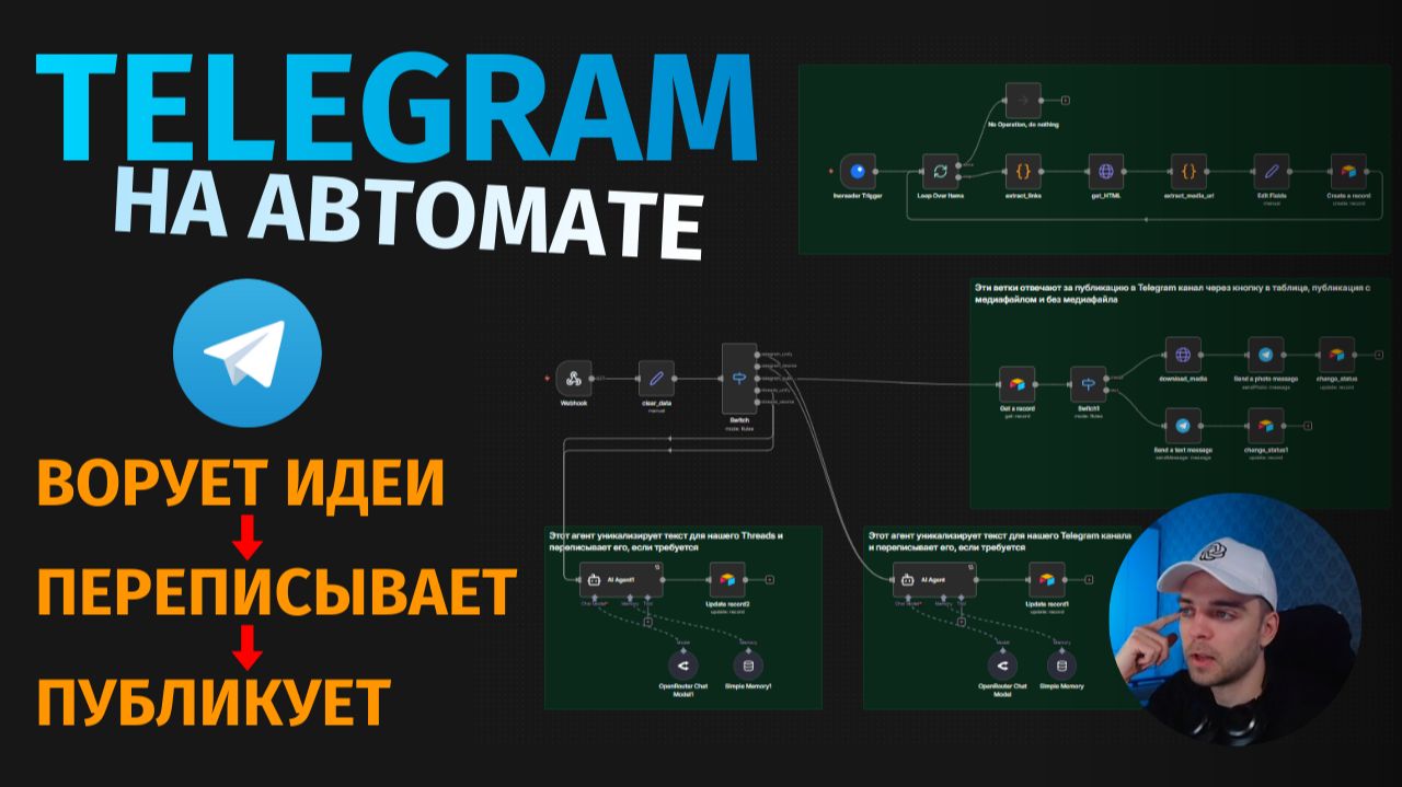 📌Важные ссылки и материалы из видео: - Наш Telegram: https://t.me/sukhov_ai - Наша база знаний о нейросетях и автоматизации (пошаговые уроки, промты, блюпринты, консультации): https://t.me/sukhov_ai/73 - Полный курс по n8n с нуля за 3 часа: https://youtu.be/WD45hW8NzLE - Инструкция по установке n8n на свой сервер Beget: https://youtu.be/KiCNSuNfut8 - Для оплаты зарубежных сервисов: https://t.me/WantToPayBot?start=w17851188--HZZ56 - Airtable: https://airtable.com/invite/r/X2o10XSo - Inoreader: https://www.inoreader.com/ Вторая часть системы парсинга контента. В этом видео собираем автоматизацию для мониторинга Telegram-каналов конкурентов: парсинг новых постов, сохранение в AirTable, рерайт через ИИ и публикация в Telegram и Twitter. Тайм-коды: 00:00 Начало: что в этой части? 01:49 Какие задачи решает, кому будет полезен 02:55 Как устроен агент? Как работает? Полный разбор, тест функций. 12:00 Разбираем каждую ноду сценария, подключаем сервисы inoreader. 📌 Что получите: - Автоматический мониторинг любых Telegram-каналов - Проверка новых постов каждый час (настраивается) - Парсинг текста, изображений и превью видео - Вся информация в одной таблице AirTable - ИИ переписывает посты в вашем стиле - Публикация в Telegram одной кнопкой - Адаптация контента под Twitter/X 📊 Что сохраняется по каждому посту: - Название канала-источника - Прямая ссылка на оригинальный пост - Полный текст со всеми ссылками - Время публикации - Изображение или скриншот видео - Переписанная версия (после рерайта) 🛠 Инструменты: - N8N (автоматизация) - AirTable (база данных + интерфейс с кнопками) - Telegram Bot API (парсинг + публикация) - OpenAI / Claude (рерайт контента) 💡 Для кого это видео: - Контент-криейторы, которые следят за конкурентами - SMM-специалисты и маркетологи - Владельцы Telegram-каналов - Все, кто хочет автоматизировать мониторинг и создание контента