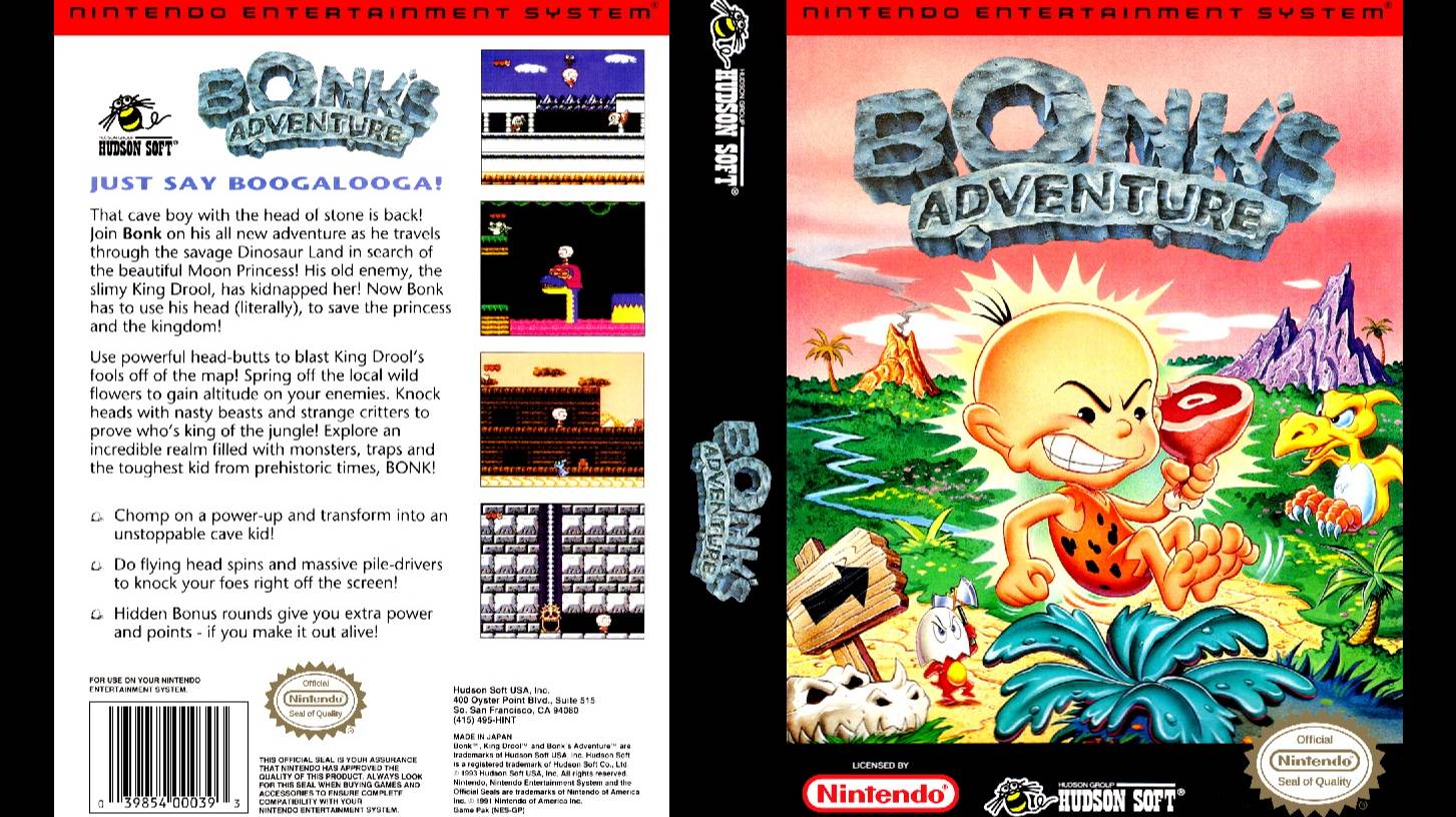 "BONK'S ADVENTURE" ("PC Genjin" в Японии) - видеоигра скролл- платформер, разработанная RED COMPANY и ATLUS в 1989 году для PC Engine/TurboGrafx-16. Персонаж Бонк, известный в Японии как PC Genjin (PC - Пещерный человек) впервые появился в комиксах, созданных для журнала Gekkan PC-Engine, чтобы продвигать консоль в Японии. В японском языке PC-Гэндзин звучит как PC-Engine, а PC расшифровывается как Pithecanthropus Computerus, что является игрой слов с Pithecanthropus erectus. "BONK'S ADVENTURE" была портирована на NES и Amiga, а также выпущена в виде аркадной игры с оплатой монетами под разными названиями (FC Genjin и BC Genjin в Японии и BC Kid в Европе). На NES игру издавала компания "HUDSON SOFT" в 1993 году, игра по механике очень похожа на "JACKIE CHAN ACTION KUNG FU", но с другой концепцией. Здесь действие происходит в доисторические времена динозавров, а играем мы за питекантропа Бонка. Нехороший Ти-Рекс по имени Друл заколдовал динозавровую принцессу За (маленькую розовую рептилию типа плезиозавра) и ее свиту, сделав своими слугами, а Вам придется всех их приводить в норму. Коронное оружие Бонка - его крепкая голова. Головою наш нецивилизованный герой успешно лупит врагов, с ее же помощью катится прямо по воздуху, плавно спускаясь вниз. Съедая по пути куски мяса, Бонк на время приобретает дополнительные возможности. Некоторая безбашенность добавляет игре шарма. Бонк атакует врагов, "бонкируя" их своим большим, неуязвимым лбом. Бонк начинает игру с тремя сердечками здоровья, которые становятся синими, когда Бонк получает урон, и тремя дополнительными жизнями. Здоровье Бонка можно постепенно восстанавливать, собирая фрукты и овощи. Бонк также может собирать куски мяса в качестве усилений; они наделяют его особыми способностями и делают его сильнее. Усиления действуют в три этапа: обычный этап, второй этап, на котором он может оглушать врагов, ударяя по земле, и третий этап, на котором он становится временно неуязвимым. Мясо бывает двух видов: большое и маленькое. Эффекты от мяса суммируются, но со временем ослабевают. Маленькое мясо даёт Бонку вторую стадию мясной силы, а большое - третью. Если съесть маленькое мясо, находясь на второй стадии, Бонк перейдёт на третью, неуязвимую стадию мясной силы. Когда эффект третьей стадии закончится, он вернётся на вторую стадию и останется там на некоторое время, прежде чем снова стать обычным Бонком. Если съесть мясо любого размера, находясь на третьей стадии мясной силы, таймер мясной силы Бонка обнулится.